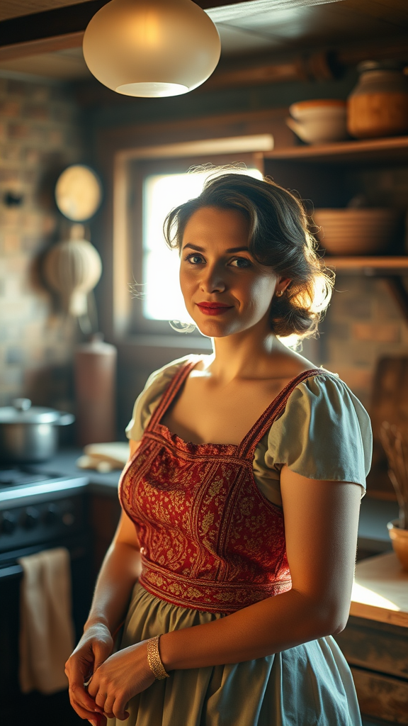 A vintage woman, softly illuminated by gentle light streaming from a rustic kitchen, surrounded by a warm, nostalgic glow.