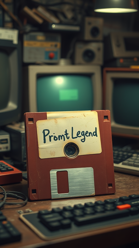 A vintage, worn-out floppy disk with "PromptLegend" scrawled in faded marker across the label, set against a backdrop of nostalgic, dimly-lit, cluttered desk filled with retro computer accessories and dim glowing screens, capturing the raw essence of a bygone digital era with a cinematic 16:9 aspect ratio and an evocative atmosphere.