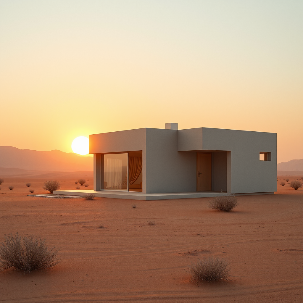A virtual still life of a minimalist ash-colored concrete modern villa nestled in the middle of a vast desert, bathed in the soft warm hues of a rising sun, with cubic Bauhaus-inspired architecture meeting futuristic and geometric lines, amidst stark desert landscapes devoid of any foliage, rendered in pristine detail using Unreal Engine's Octane render, showcasing 8k resolution, de-noised, with in-frame processing, creating an ultra-realistic cinematic setting, evoking the plain yet refined spirit of 19th-century still life masters like Jean Leon Gerome