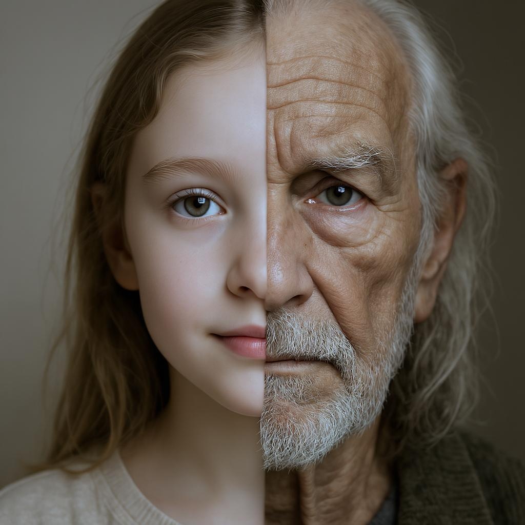 A visage blending youthful innocence and timeless wisdom, featuring one side of a young girl's delicate features transitioning seamlessly into the deeply lined, expressive countenance of an elderly person in their eighties, set against a harmonious 4:5 aspect ratio with soft lighting to emphasize the contrasts and connections, evoking a sense of continuity and the passage of life.