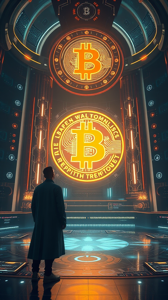 A visionary figure clad in futuristic attire stands in awe before a glowing, monolithic Bitcoin symbol, their eyes reflecting a blend of reverence and digital enlightenment amid a high-tech temple adorned with holographic symbols and shimmering circuits, the air pulsating with an ethereal energy as they partake in a ritual that merges cutting-edge technology with age-old spiritual practices, creating a harmonious fusion of man and machine in a photorealistic landscape.