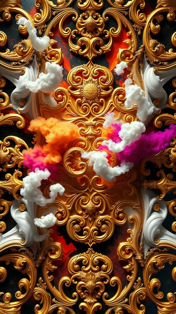 A visionary scene of future growth illustrated in an opulent, emotive blend of Golden Baroque and Rococo styles, capturing beauty as a seamless, transcendental pattern. Symmetrical and adorned with grand motifs reminiscent of the Sistine Chapel ceiling, this 8k image is rendered with supersharp precision. It features spirals and swirls in rococo elegance, interwoven with intricate cartouches. White smoke and vibrant rainbow ink gently immerse in water, juxtaposed against a palette of gold, black, and rainbow hues. Perfect symmetry governs the composition, enhanced by 3D depth, hyper-realism, and sharp focus with photorealistic detail. Breathtaking cinematic lighting crafted with Octane render brings the epic scene to life, depicting an insane level of detail and intricacy, capturing the essence of dramatic and elaborate styles.