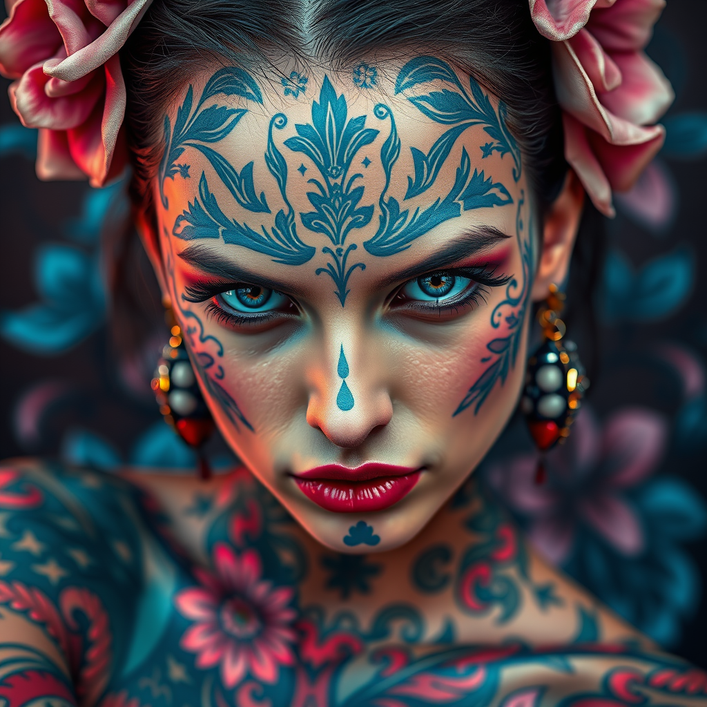 A visionary tattoo artist adorned with elaborate blue tattoos and floral designs over her skin, exuding a futuristic fantasy aura. Her intense gaze captivates, captured in a high-resolution oil portraiture style. The composition blends light red and teal with dark pink and light blue accents, drawing from the elegance of rococo portraitures. She poses with a commanding presence in a photo shoot, her image transformed through digital manipulation. The influence of artists like Tanya Shatseva and Daniel F. Gerhartz is evident, as intricate imagery unfolds in an ultra-high-definition masterpiece. The portrayal balances the dark and explosive energy with delicate beauty, creating a striking contrast in this dynamic oil portrait.
