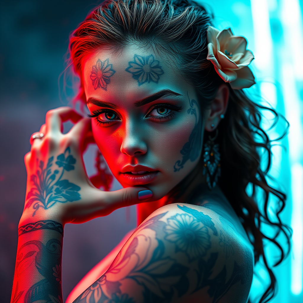 A visionary tattoo artist adorned with intricate blue tattoos and floral motifs across her skin, set in a futuristic fantasy realm, her intense gaze captivating. The composition is an oil portraiture with a high resolution, blending light red and teal hues. Drawing influence from rococo portraiture, the scene is dark and explosive, capturing the tattooed girl's dynamic pose in a photo shoot. The image is digitally manipulated, echoing the styles of Tanya Shatseva and Daniel F. Gerhartz, woven with dark pink and soft blue tones. Rich, detailed imagery embodies the essence of an UHD oil portraiture, with an ethereal yet powerful atmosphere.