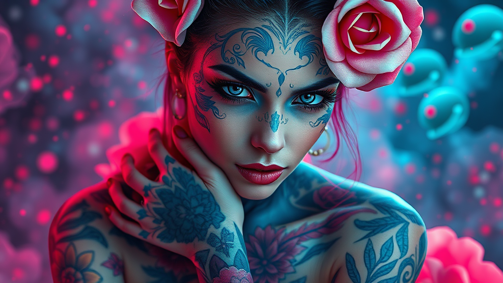 A visionary tattoo artist adorned with vibrant blue tattoos and ethereal floral designs on her skin, set in a futuristic fantasy world. Her intense gaze captures attention in an oil portraiture style, blending light red and teal hues. The scene radiates high resolution and echoes rococo portraitures, merging with a dark and explosive atmosphere. This tattooed muse is striking a pose reminiscent of a photo shoot, with influences of digital manipulation. The artwork takes cues from the styles of Tanya Shatseva and Daniel F. Gerhartz, interweaving dark pink and light blue tones. The imagery is intricate and richly detailed, presented in an ultra-high-definition format, embodying the elegance of oil portraitures.