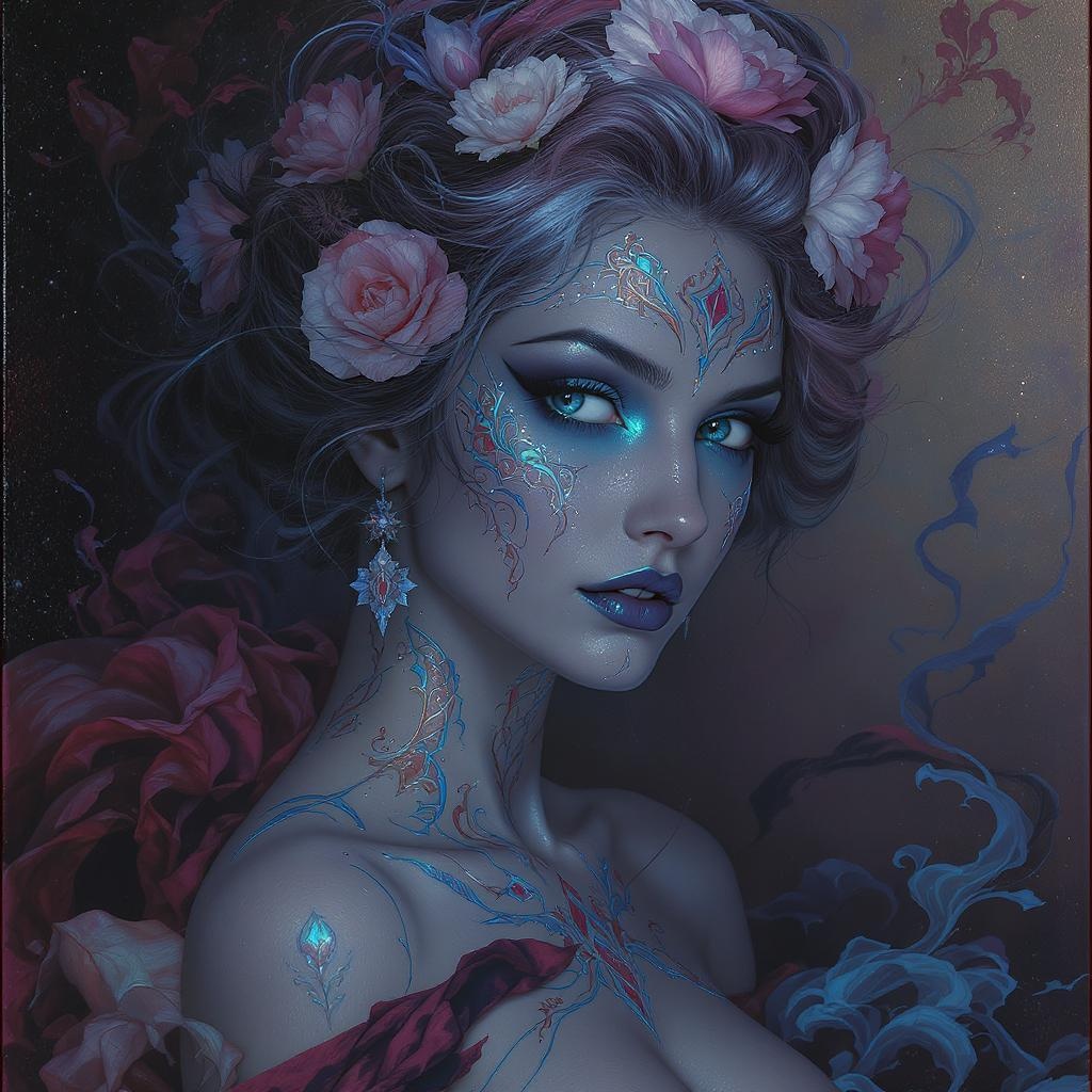 A visionary tattoo artist with shimmering blue ink and ethereal flowers adorning her skin, capturing the essence of futuristic fantasy. Her intense gaze pierces through the canvas, reminiscent of a digital manipulation merging the styles of Tanya Shatseva and Daniel F. Gerhartz. The portrait, resembling rococo artwork with a modern twist, features a palette of light red and teal, intertwined with dark pink and soft blue. She poses elegantly in a high-resolution photoshoot setting, the intricate imagery giving the impression of an explosive yet harmoniously crafted oil portrait. The combination of dark and bright hues enhances the immersive quality of the piece, evoking a sense of delicate power and creativity.