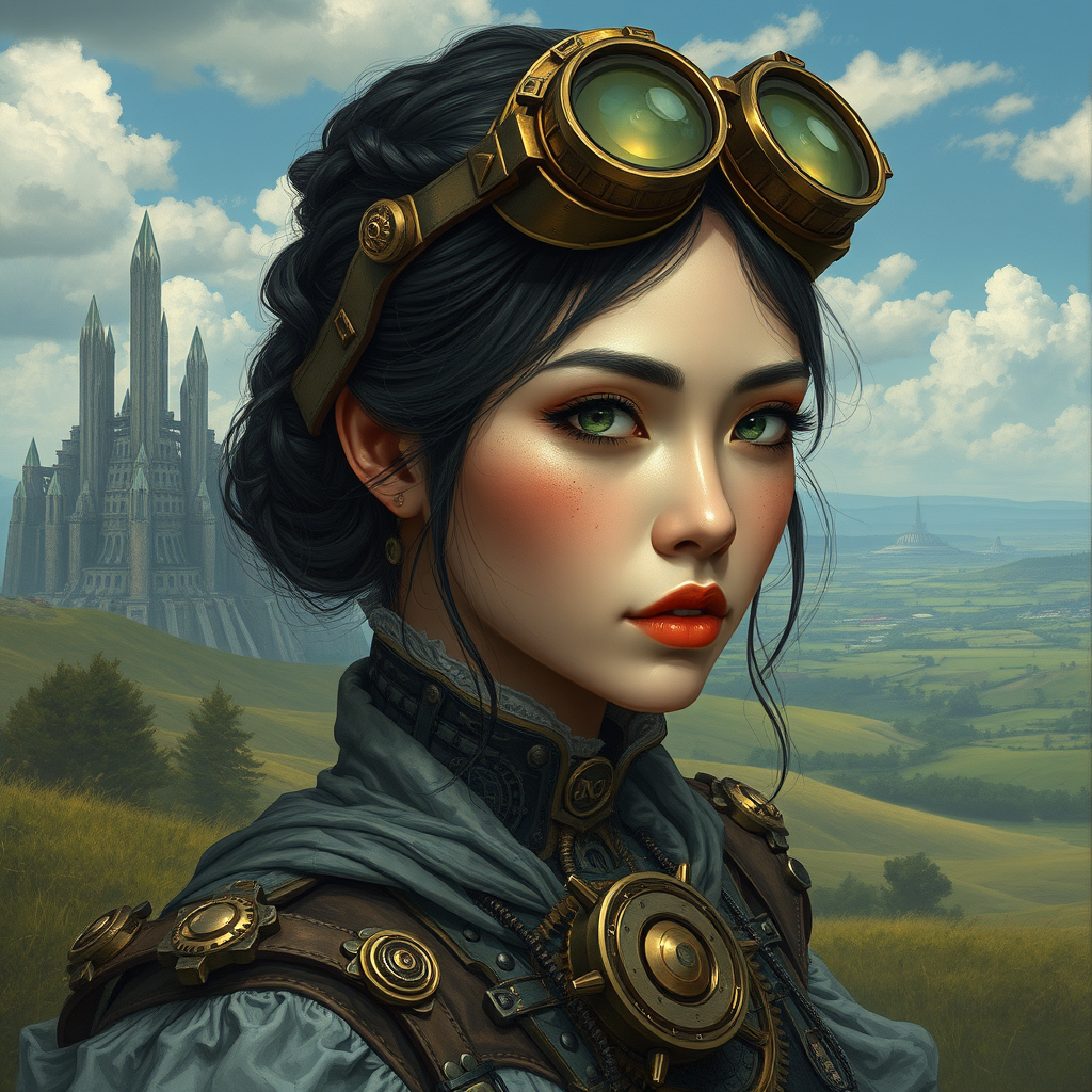 A visionary woman with intricate goggles perched on her head, crafted by Rudy Siswanto, featuring fantasy art elements with a touch of realism, her expression exuding an air of intelligence and curiosity; her attire a blend of mystical and mechanical, seamlessly merging fine fabrics with metal gears and intricate clockwork details, surrounded by a landscape that blends the fantastical with the real—a distant skyline dotted with towering crystal structures and lush, rolling meadows, the atmosphere charged with an aura of wonder and mystery.