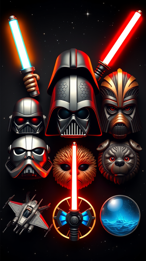 A visually captivating composition featuring a detailed and realistic arrangement of eight unique Star Wars-themed emojis, rendered in stunning 8k with octane-like realism. The table layout showcases each emoji with intricate and vibrant details, including a lightsaber emoji with a glowing blade, a wise Jedi master emoji with expressive features, a menacing Sith lord emoji with a dark, flowing cape, a charming droid emoji with metallic textures, a fierce Wookiee emoji with defined fur details, a sleek starfighter emoji with intricate designs, a mystical power using force symbol emoji, and a serene galactic landscape emoji with starry vistas. Each element is crafted with precision, reflecting the vastness of the Star Wars universe while adding a touch of creative flair to enhance the iconic imagery.