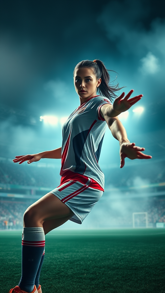 A visually captivating full-body photograph of a female soccer player in action, set in a grand stadium with atmospheric volumetric lighting and mist. The scene exudes intricate detail and breathtaking beauty, characterized by precise lineart and vibrant colors. The composition embraces a comprehensive cinematic style, drawing inspiration from artists like Sandra Chevrier and Anna Dittmann. The player strikes a dynamic pose, showcasing graceful and expressive hands and a captivating, beautiful face. Subtle creative adjustments enhance the overall allure while maintaining the core essence of the subject.