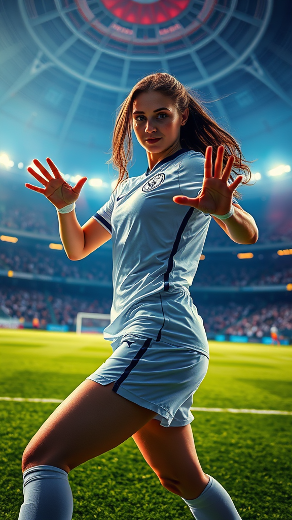 A visually captivating full-body photograph of a female soccer player on the field, set in a majestic stadium with volumetric lighting and atmosphere; the scene is centered, intricate, and highly detailed, showcasing breathtaking beauty and precise lineart. The composition is vibrant and cinematically comprehensive, drawing inspiration from the styles of Sandra Chevrier and Anna Dittmann. The athlete strikes a dynamic pose, her pretty hands and beautiful face exuding confidence and grace. The atmosphere is energized and alive, reflecting the passion and intensity of the sport while maintaining the core essence of stunning visual artistry.