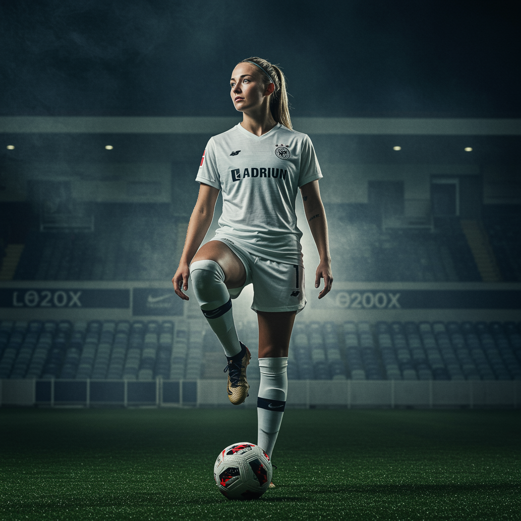 A visually captivating full body photograph of a female soccer player in a stadium setting, enveloped in volumetric lighting and atmosphere, centered composition capturing intricate details, breathtaking elegance, and precise lineart. The scene is vibrant and cinematic, with influences from Sandra Chevrier and Anna Dittmann, showcasing a dynamic pose with graceful hands and a beautiful face.
