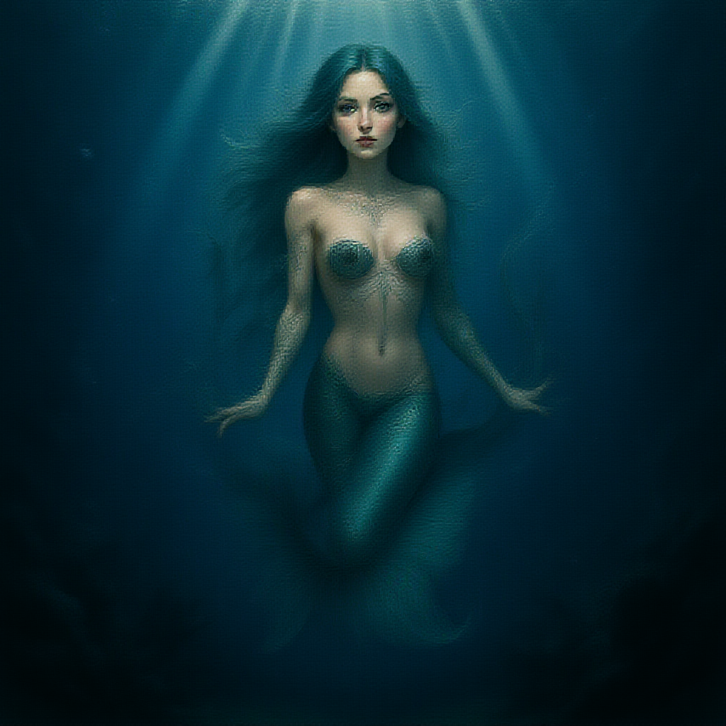 A visually captivating image of a stunning mermaid, set in the enchanting depths of the ocean. She strikes a dynamic pose at the center, serving as the key visual, with intricate and highly detailed features that showcase breathtaking beauty. The composition has precise linework and vibrant colors, akin to a comprehensive cinematic style reminiscent of artists like Carne Griffiths, Conrad Roset, and Anna Dittmann. The scene is illuminated by underwater caustics and low sunbeams, creating a mesmerizing atmosphere. Despite its allure, the image includes subtle imperfections like jpeg artifacts, signature marks, and potential anatomical quirks, adding an artistic charm. The mermaid's form is both enchanting and slightly unconventional, capturing a unique essence that is both mystical and otherworldly.