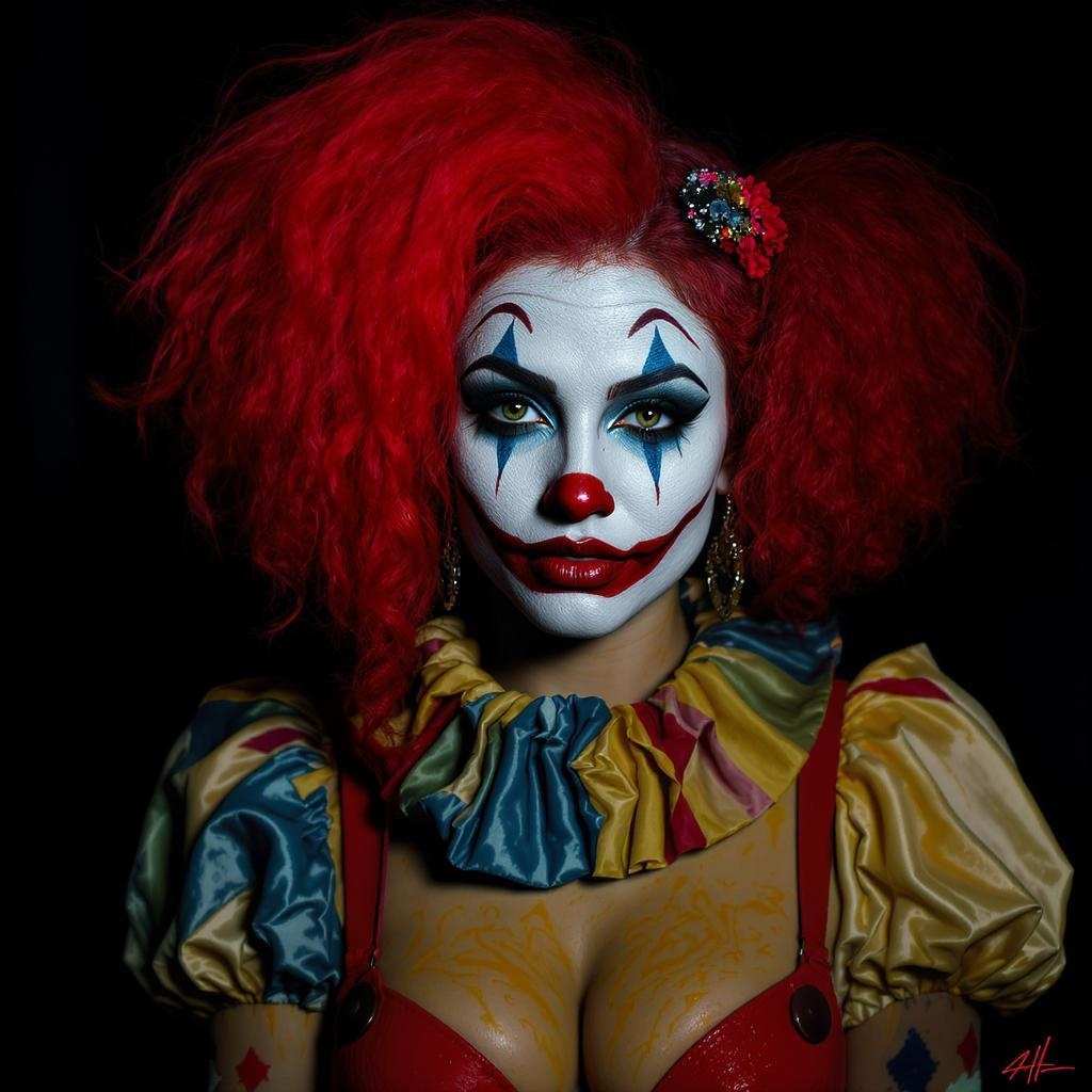 A visually captivating portrait of a woman adorned with striking clown makeup, meticulously centered and highly detailed, showcasing breathtaking beauty with precise linework. The composition is vibrant and cinematic, capturing a dynamic pose with the finest quality akin to Stefan Gesell's style. The scene is enriched with vivid colors, though touches of low resolution, text, and errors subtly intertwine. Limbs may exhibit variations like missing fingers or extra digits, while some elements might appear cropped or affected by jpeg artifacts. Despite the impeccable beauty, hints of bad anatomy and disfigurement subtly emerge, with oddities like extra limbs or digits. Certain sections might appear out-of-frame, slightly blurry, or deformed, contributing an abstract twist. Watermarks and signatures subtly blend into the composition, while no explicit nudity or identifiable text is present, maintaining an artistic and enigmatic allure.