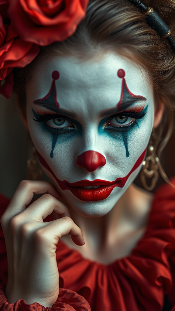A visually captivating portrait of a woman with intricate clown makeup, centered and highly detailed, showcasing breathtaking beauty with precise lineart and vibrant colors. The scene is cinematic, featuring a dynamic pose, highlighting the best quality akin to Stefan Gesell's style. The composition is clear and focused, ensuring clean anatomy and proportional details. The woman is beautifully framed, without any distortions, and the image is free of technical errors like low resolution, JPEG artifacts, or digital flaws. The focus remains on the artistic expression, without any intrusive text, watermarks, or unnecessary signatures. The artwork emphasizes creativity and elegance, presenting a flawless representation free from any awkward or uncanny elements.