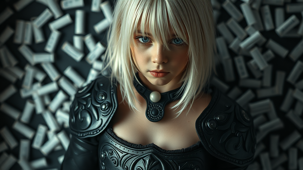 A visually captivating scene featuring a beautiful young girl with medium-length white hair, her toned midriff exposed. She's clad in intricate black armor, her face detailed and striking. The composition adheres to the Rule of Thirds, creating an award-winning visual masterpiece. The setting is adorned with an array of pain relievers, intricately overlapping in the composition. Shot on Ilford HP5 film, the photograph showcases crushed blacks and shadows, boasting depth of field and natural light. A film grain texture pervades, enhancing the deep blacks and adding character. The aura is dark yet sophisticated, capturing a raw, emotional depth.