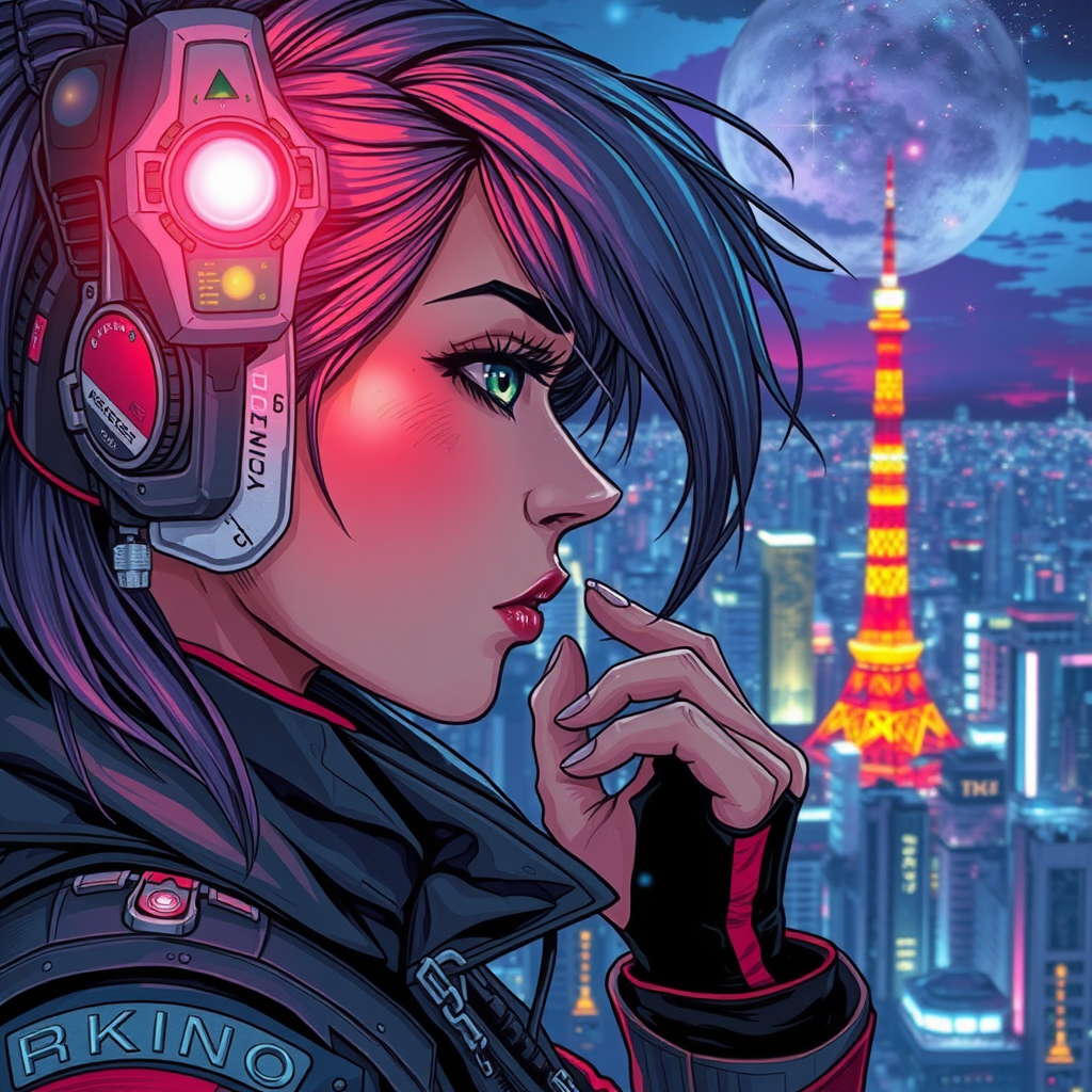 A visually striking portrait of a female cyberpunk gazing over the Tokyo skyline, perfectly centered with key visual elements. The scene features intricate and highly detailed artwork, capturing breathtaking beauty with precise lineart. The image bursts with vibrant colors and comprehensive cinematic flair, drawing inspiration from the styles of Carne Griffiths and Conrad Roset. The atmosphere evokes the aesthetic of Borderlands, with neon hues and a touch of sparkle illuminating the night cityscape.