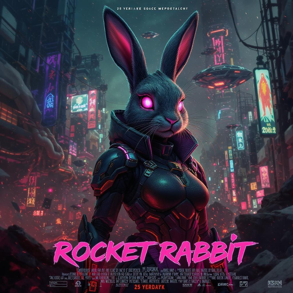 A visually striking poster of a rocket rabbit in a gritty yet enchanting dystopian future, featuring a stunningly attractive 25-year-old humanoid rabbit. The scene captures a perfect blend of cute and cyberpunk elements, with masterful detailing and studio lighting. The backdrop showcases a beautifully chaotic landscape, bustling with futuristic technology and vibrant neon lights. The humanoid rabbit stands center stage, exuding confidence and allure, embodying the grimdark charm of a dark future through their sleek, high-tech attire and charismatic presence.