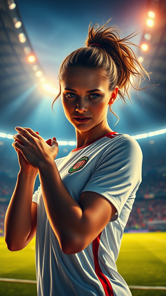 A visually stunning full body portrait of a female soccer player in a dynamic pose within a brightly lit stadium, enveloped by volumetric lighting and a vivid atmosphere. The scene is centered and meticulously detailed, capturing breathtaking beauty and precise lineart. The composition exudes vibrant energy with a comprehensive cinematic quality, inspired by the styles of Sandra Chevrier and Anna Dittmann. Her hands are elegantly positioned, complementing her beautiful face, as the intricate details illustrate both strength and grace.