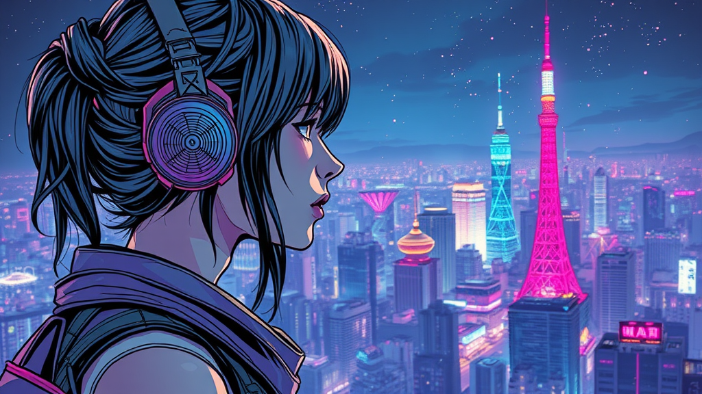 A visually stunning image of a female cyberpunk gazing at the Tokyo skyline, perfectly centered with intricate and highly detailed lineart capturing breathtaking beauty. The scene is vibrant with neon sparkles, evoking a comprehensive cinematic feel reminiscent of Carne Griffiths and Conrad Roset's styles blended with the aesthetic of Borderlands.