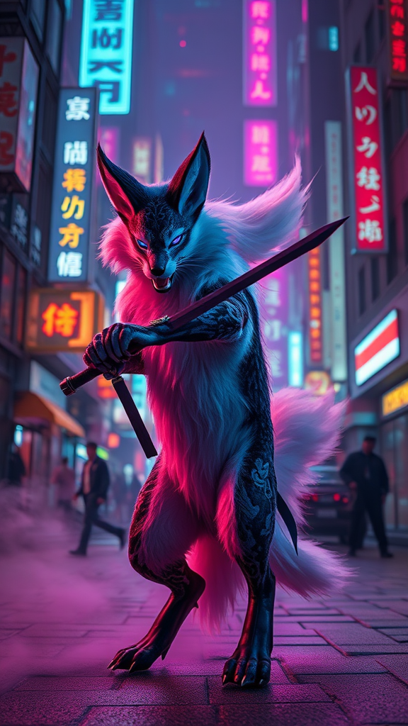A visually stunning image of a majestic kitsune in a cyberpunk city, illuminated by vibrant neon lights. The full-body portrayal captures its breathtaking beauty and dynamic fighting pose in ultra-sharp focus, with cinematic lighting creating a dramatic atmosphere. Volumetric fog and bioluminescence add depth to the scene. The attention to detail ensures a comprehensive cinematic experience, with the kitsune gracefully wielding a weapon. Against this urban backdrop, the scene exudes an otherworldly charm, encapsulating the mysterious allure of the kitsune amidst a futuristic landscape.