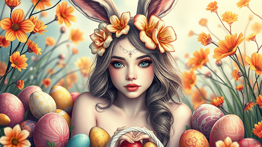 A visually stunning photo capturing the essence of an Easter bunny girl, merging human grace with the charm of a bunny, surrounded by vibrant Easter eggs. Centered and serving as the key visual, this breathtaking scene showcases intricate details and precise lineart. The image embodies vibrant colors and comprehensive cinematic composition, reminiscent of the artistic styles of Carne Griffiths and Conrad Roset, with small creative nuances that elevate the ethereal beauty of the subject.