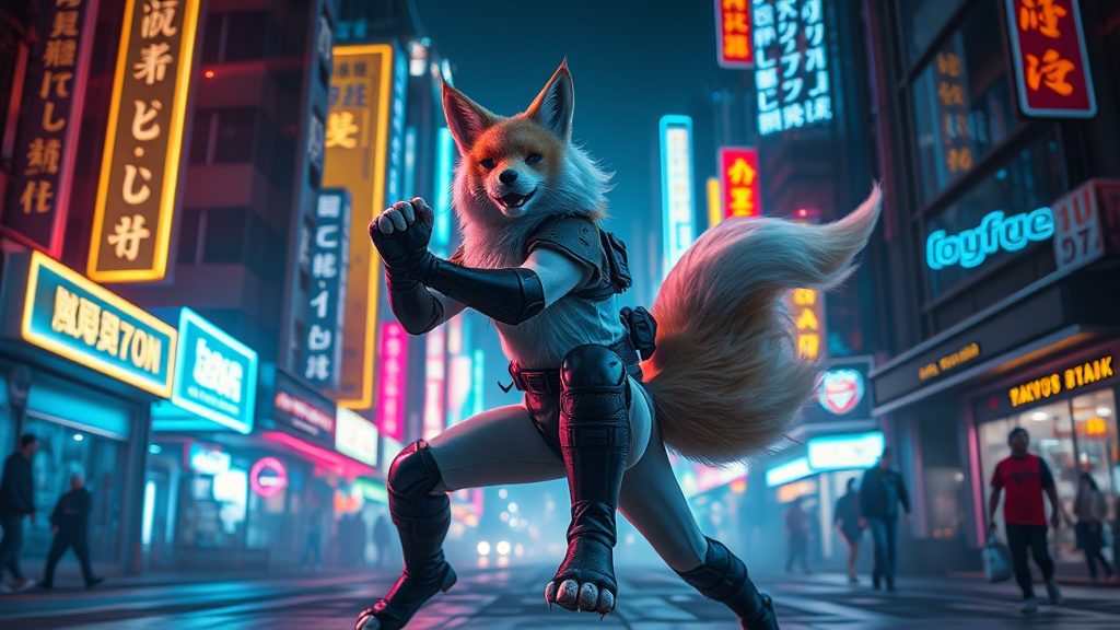 A visually stunning photo of a full-body kitsune in a dynamic fighting pose within a vibrant cyberpunk city, illuminated by neon lights. The scene captures breathtaking beauty with ultra-sharp focus and cinematic lighting, enhanced by volumetric fog, bioluminescence, and a complex atmospheric setting. The kitsune is adorned with military-style knee pads, rendered in UHD and HDR for a striking visual impact. The image avoids visual distortions, maintaining high quality with no duplicates or mutations. The composition is seamless, ensuring all elements are in frame without blurriness or unwanted artifacts, celebrating a comprehensive cinematic style inspired by studio trigger aesthetics.