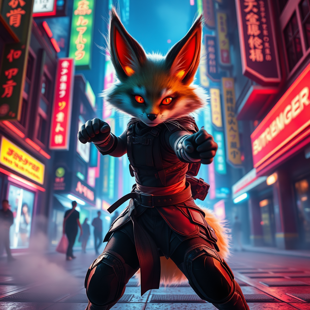A visually stunning photo of a kitsune in a cyberpunk city, glowing with neon lights, exuding vibrant colors. The scene captures a full-body view in a dynamic fighting pose, showcasing breathtaking beauty and high detail. The emphasis is on a cinematic atmosphere, enhanced by volumetric fog and a bioluminescent glow, creating a comprehensive cinematic experience. The kitsune wears a military-style outfit with knee pads, reminiscent of a Studio Trigger anime aesthetic. The focus is ultra-sharp, capturing the essence in UHD, HDR, and 16K quality. The setting exudes a sense of movement and energy, highlighted by cinematic lighting and a volumetric atmosphere, ensuring clarity and immersion without distractions. The environment is devoid of cloned features, disfigurements, or mutations, maintaining the authenticity and seamlessness of the scene.