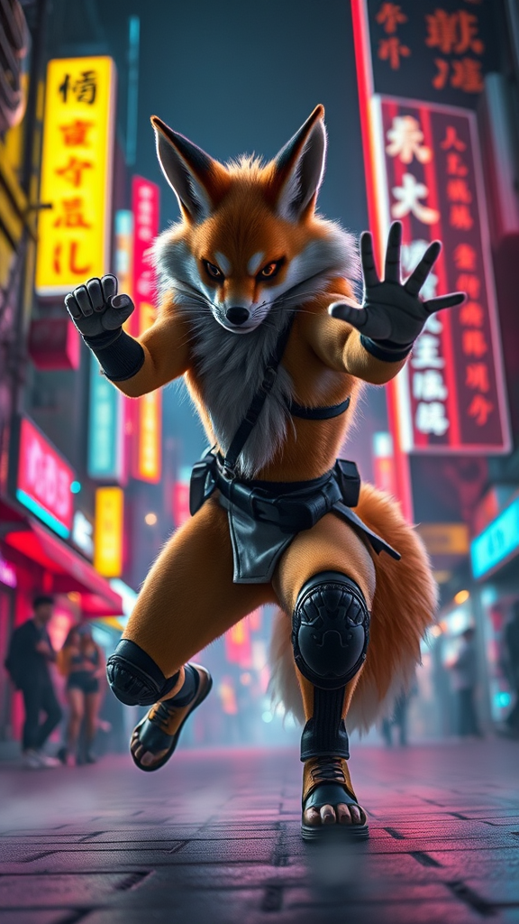 A visually stunning photo of a kitsune in a dynamic fighting pose amidst a cyberpunk cityscape, surrounded by glowing neon lights and vibrant colors, showcasing breathtaking beauty with full-body focus. The scene captures a highly detailed and comprehensive cinematic atmosphere, featuring cinematic lighting, volumetric fog, and bioluminescence blending with a volumetric atmosphere. The kitsune wears military-style knee pads reminiscent of those from a studio trigger animation. The image is delivered in the best quality, ultra-sharp focus with UHD, HDR, and 16K resolution. The character is posed in dynamic motion, embodying the essence of action and grace. The setting emphasizes a harmonious fusion of traditional mystique and futuristic elements, with no distractions like duplicates, disfigurements, or extraneous details to maintain the purity and clarity of the vision.