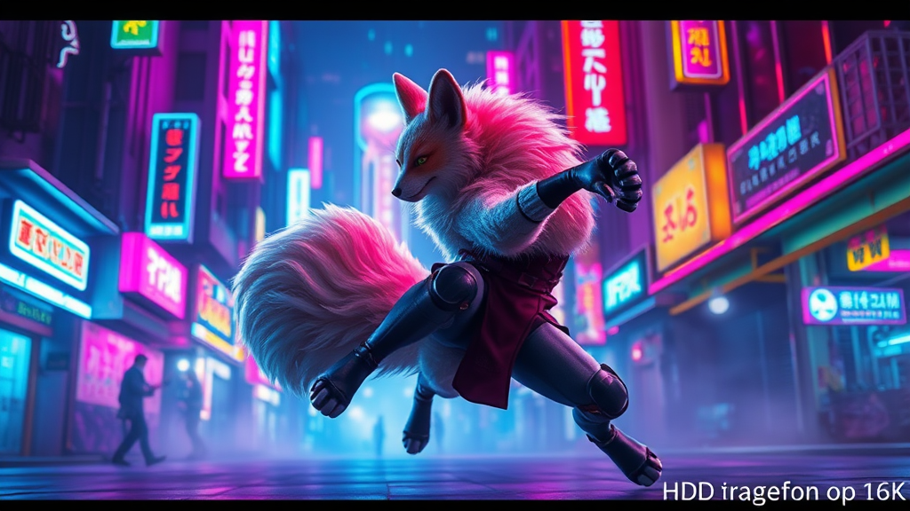 A visually stunning photo of a kitsune in a neon-lit cyberpunk city, glowing with vibrant colors and breathtaking beauty. The scene captures a full-body view of the kitsune in a dynamic fighting pose, showcasing cinematic lighting with volumetric fog and bioluminescence. The atmosphere is enhanced by the detail of a studio-trigger military style featuring knee pads. The overall composition is ultra-sharp, high-quality, with an HDR, UHD resolution reaching up to 16K, designed to be captivating and immersive with a comprehensive cinematic quality. The kitsune's graceful movements and majestic presence stand out amidst the vibrant urban backdrop, with no visual imperfections or distortions, ensuring seamless clarity without any out-of-frame elements or distracting artifacts.