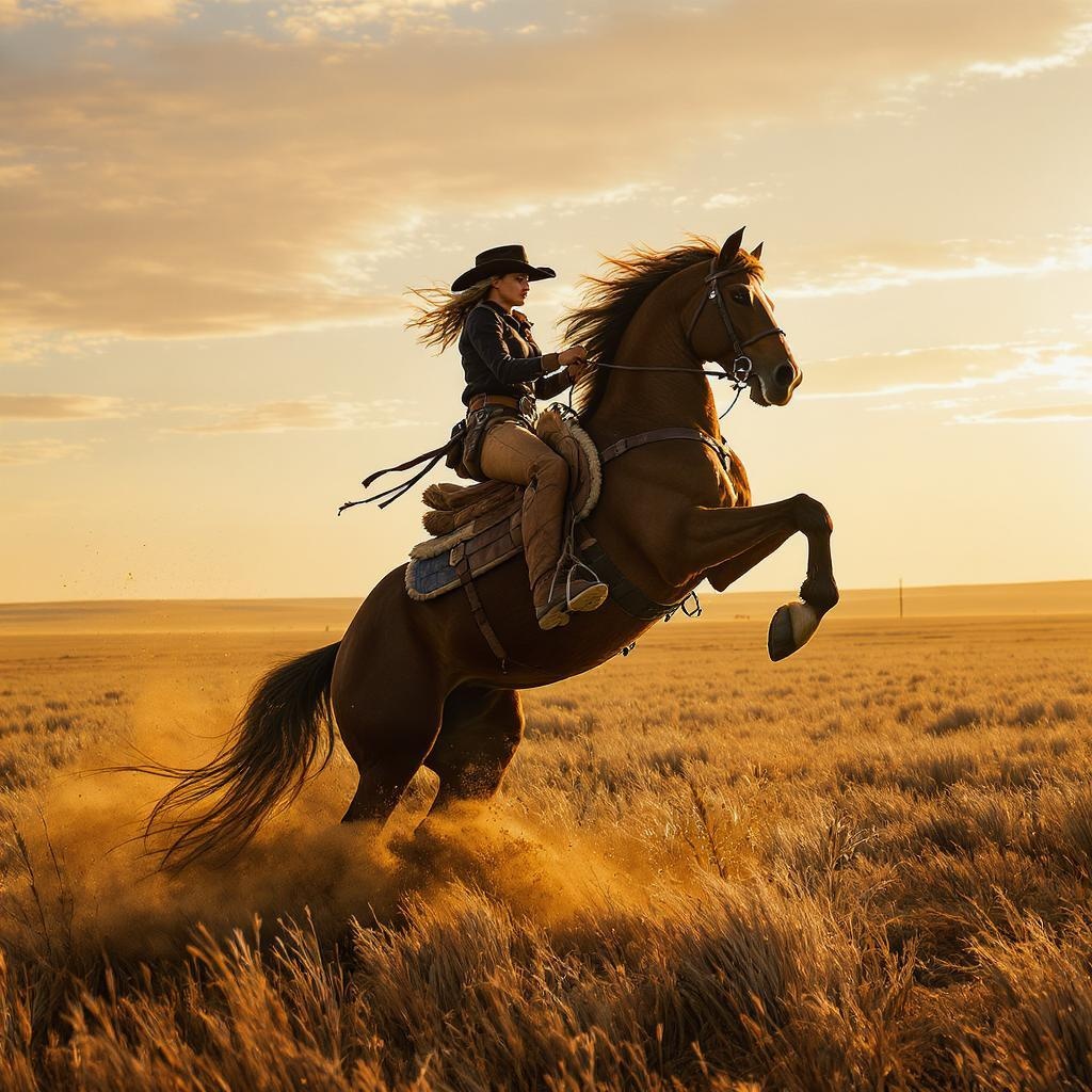 A visually stunning photograph captures a female cowboy skillfully guiding her horse as it rears up on hind legs amidst the vast prairie. The composition is central, drawing the eye to the intricate and highly detailed elements that blend seamlessly to create breathtaking beauty. Precise line art and vibrant colors enhance the comprehensive cinematic quality, with ultra-sharp focus bringing every detail to life. A volumetric atmosphere adds to the scene's depth, painted vividly by the warm hues of a setting sun over the borderlands. The image is free from any visual distractions or errors, presenting a flawless depiction of harmony between rider and steed, exuding strength and grace in this dynamic moment.