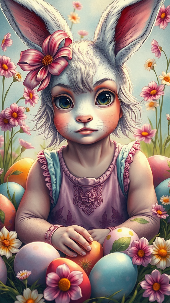 A visually stunning photograph of an Easter Bunny depicted as a girl, surrounded by vividly colored Easter eggs; the scene is centered with striking key visuals. The depiction features intricate and highly detailed elements, capturing breathtaking beauty through precise lineart. The imagery is vibrant and exudes a comprehensive cinematic quality, drawing inspiration from the styles of Carne Griffiths and Conrad Roset. The composition seamlessly blends whimsy and elegance, with the girl embodying the essence of a playful yet enchanting Easter spirit.