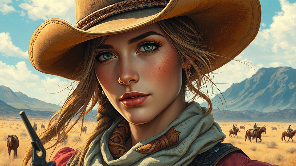 A visually stunning portrait of a female cowboy set in a western landscape, capturing the essence of a cowboy-centric scene with intricate detail and breathtaking beauty. The composition boasts precise lineart, vibrant colors, and a comprehensive cinematic feel, reminiscent of the unique styles of Carne Griffiths and Conrad Roset, combined with the highest quality visual presentation.