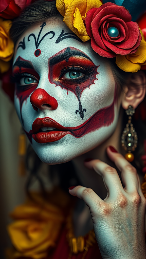 A visually stunning portrait of a woman with intricate clown makeup, centered and highly detailed, showcasing breathtaking beauty with precise linework. The vibrant and comprehensive cinematic style captures a dynamic pose, emphasizing the best quality, reminiscent of Stefan Gesell's art. The image is free from errors such as missing or extra digits, cropped elements, or jpeg artifacts. There is an absence of signature marks, and the anatomy is flawlessly depicted without any disfigurements or mutations. The portrayal does not include any watermarks, texts, or artist names, ensuring a focus on the subject's captivating presence and artistry.