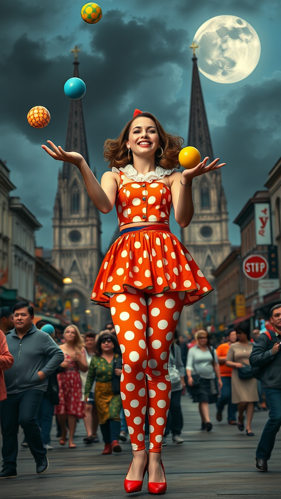 A vivacious woman with a kind smile stands in a crowded city, embodying the essence of a classic pin-up clown. Her outfit is a playful ensemble featuring polka-dot leggings that emphasize her vibrant and generous spirit. Amidst the bustling streets, she juggles colorful balls with effortless grace, her joyful presence illuminating the scene. In the background, a majestic cathedral rises, adding a touch of grandeur, while an ominous sky with a partially clouded full moon casts dramatic shadows. Volumetric lighting enhances the hyper-realistic atmosphere, evoking the masterful touch of an oil painting reminiscent of Frank Frazetta’s style, where every detail breathes life into this captivating moment.