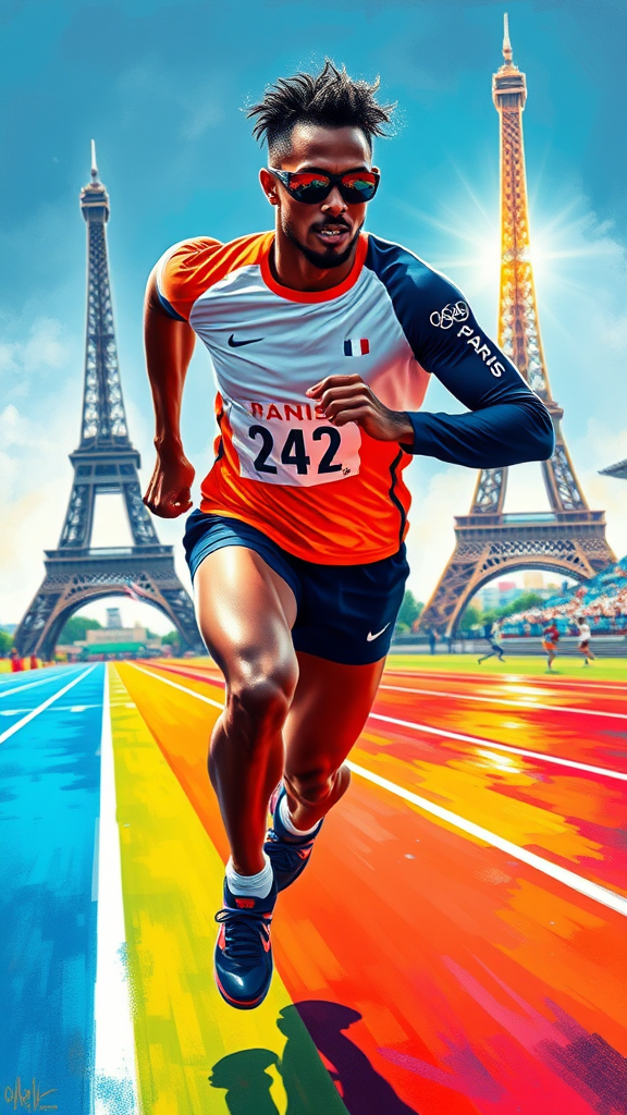 A vivid airbrushed painting of a determined Olympic runner, in a style reminiscent of Greg Rutkowski, showcasing dynamic motion and intricate detail. The athlete, adorned in vibrant gear and sleek France Olympic attire, with "Paris - 2024" elegantly emblazoned on one sleeve, sprints energetically on a luminous rainbow-colored track. Sporting stylish sunglasses, his figure is dramatically framed against the iconic silhouette of the Eiffel Tower basking in the background. The scene captures a moment of pure athletic excellence and the vibrant spirit of competition, encapsulating the essence of the Paris Olympics.