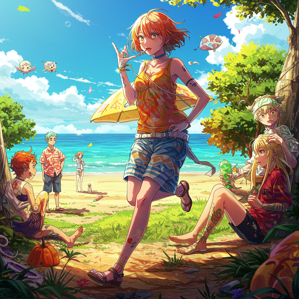 A vivid and captivating anime painting of a solarpunk summer day, inspired by the styles of Tim Okamura, Victor Nizovtsev, Greg Rutkowski, and Noah Bradley. The artwork is trending on Artstation, showcasing an 8k masterpiece with graffiti paint, showcasing fine and intricate details. The illustration is bursting with color and follows the golden ratio. While retaining a sense of artistic perfection, there are intentional elements of surrealism, such as subtly distorted anatomy and exaggerated features, which enhance the imaginative landscape. Unique and creative mutations are woven into the scene, adding a dreamlike quality. The hands and limbs are whimsically portrayed, appearing in unexpected positions, contributing to the artwork's charm. The composition is a harmonious blend of beauty and the unconventional, drawing the viewer into a world where creativity knows no bounds.