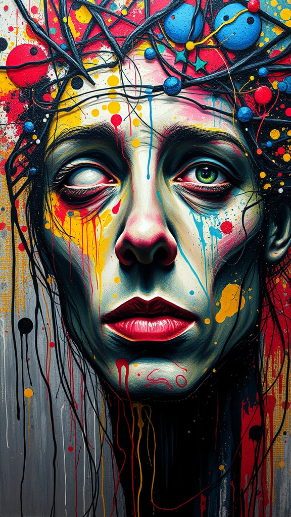 A vivid and chaotic exploration of color and form, capturing the essence of a tormented artist's soul. Entangled lines and splatters dance across the canvas in a whirlwind of emotion, revealing glimpses of an abstract visage. The self-portrait pulsates with dynamic energy, where the boundaries of identity blur within a maze of textured layers and bold hues, evoking a profound sense of introspection and creative madness.