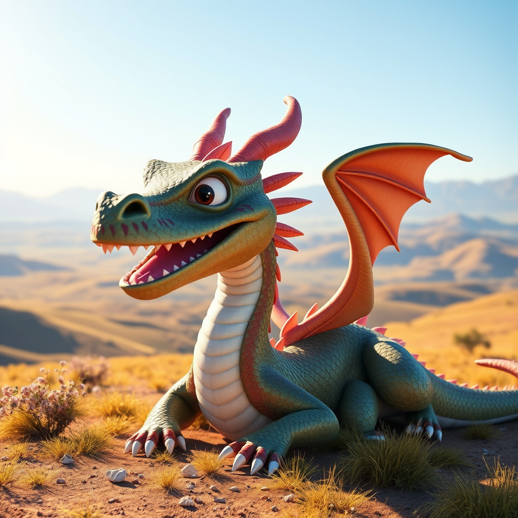 A vivid and cinematic 3D image of a dragon basking in a bright sunny landscape, capturing the whimsical and playful Pixar style, with intricate scales shimmering in the sunlight and a joyful expression on its face, set against a broad expanse with rolling hills and a clear blue sky, maintaining an artistic and stylized approach for a lively and enchanting scene.