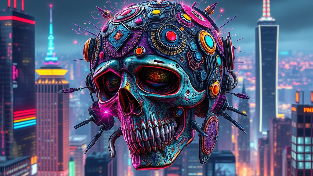 A vivid and colorful cyberpunk skull adorned with intricate, maximalist armor detail, shimmering with neon hues and enhanced by an array of dynamic patterns. The skull's structure is emphasized, featuring complex circuitry and holographic embellishments, all set against a towering futuristic cityscape. The chaotic infusion of colors and elements adds a sense of energetic vibrancy to the piece, capturing the essence of a technologically advanced yet dystopian world, in a dynamic 9:16 aspect ratio.