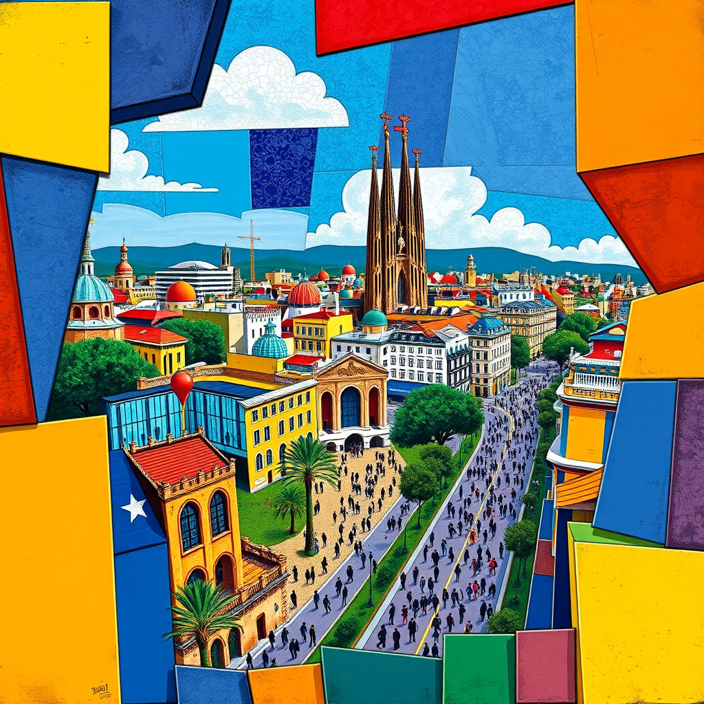 A vivid and colorful representation of Barcelona, Spain unfolds through the imaginative lens of Pablo Picasso, capturing the essence of the city in a Cubist style. The scene is fragmented and composed of bold geometric forms, each one depicting iconic landmarks such as the Sagrada Familia with its intricate spires, Park Güell with its whimsical mosaics, and the bustling La Rambla filled with lively silhouettes of people. A wide-angle perspective offers a sweeping view of the cityscape from above, showcasing Barcelona's diverse architecture—Gothic, modernist, and contemporary—blending seamlessly into a dynamic collage. The palette is rich and vibrant, dominated by blues, reds, yellows, and greens that echo Picasso's signature style, each hue enhancing the scene's energy and depth. The composition is framed with a dynamic balance, reflecting both the vibrant life of Barcelona and the abstract, multifaceted nature of Cubism. A subtle play of light and shadow adds texture to the scene, emphasizing its movement and vitality, while the creative modifications retain the core concept of a city that is both timeless and ever-evolving.