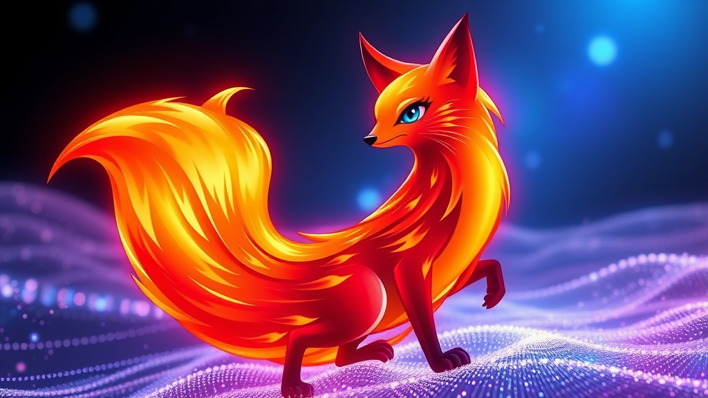 A vivid and detailed animation of a fox inspired by the Firefox browser logo, featuring a sleek, flame-hued coat that glows with vibrant shades of orange and red. The fox moves with graceful agility, its eyes sharp and intelligent, reflecting a deep blue reminiscent of the earth it circles. Its tail is an intricate swirl of fiery colors, capturing the dynamic energy and open-source spirit of its digital counterpart. The scene is set against a shimmering digital landscape that adds a touch of modernity and innovation, with the fox leaving a trail of ethereal light as it elegantly weaves through this virtual world.