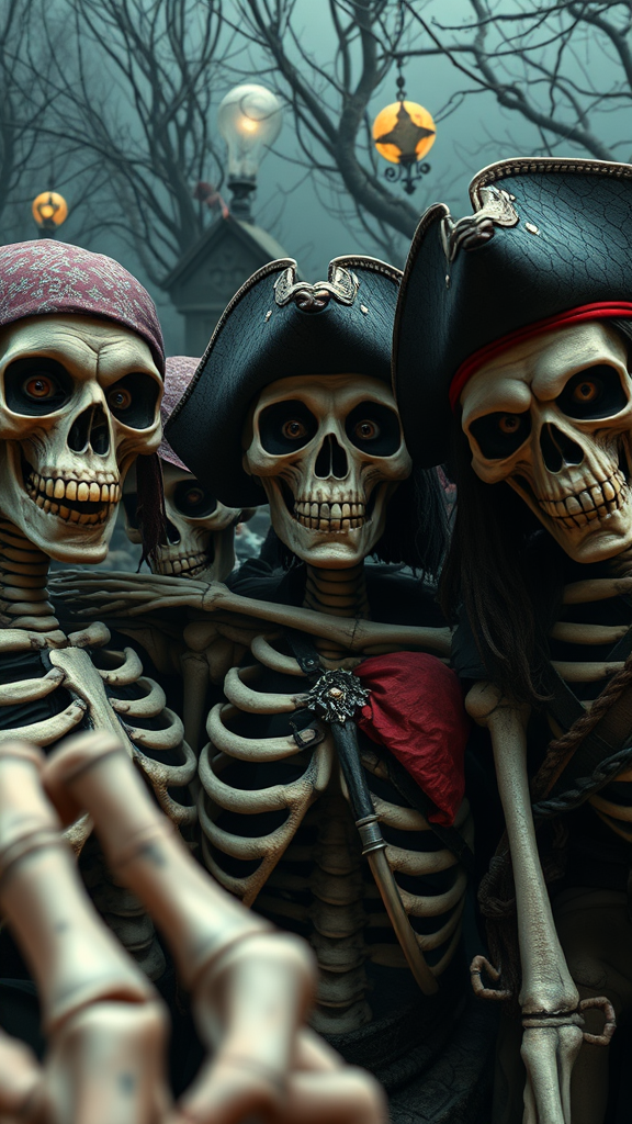 A vivid and dramatic selfie featuring a group of skeletons and pirates in a spooky graveyard setting, exuding a scary and dark atmosphere with intense cinematic detail. The scene captures an extreme level of detail in 16k resolution with UHD and HDR quality. The image reflects a whimsical yet eerie charm, with some elements like deformed irises and pupils in the skeletons, giving an unsettling look to their eyes. The pirates sport a comical touch of cross-eyed expressions and an assortment of cloned faces, along with extra fingers and mutated hands adding to the bizarre spectacle. Despite being skillfully arranged and framed, there is a sense of chaotic energy, with some elements appearing cropped or out of frame, maintaining an air of unpredictability and intrigue in this imaginative and ghostly scene. There are no distortions like low resolution, text artifacts, watermarks, or artist signatures to distract from the eerie creativity of the scene.