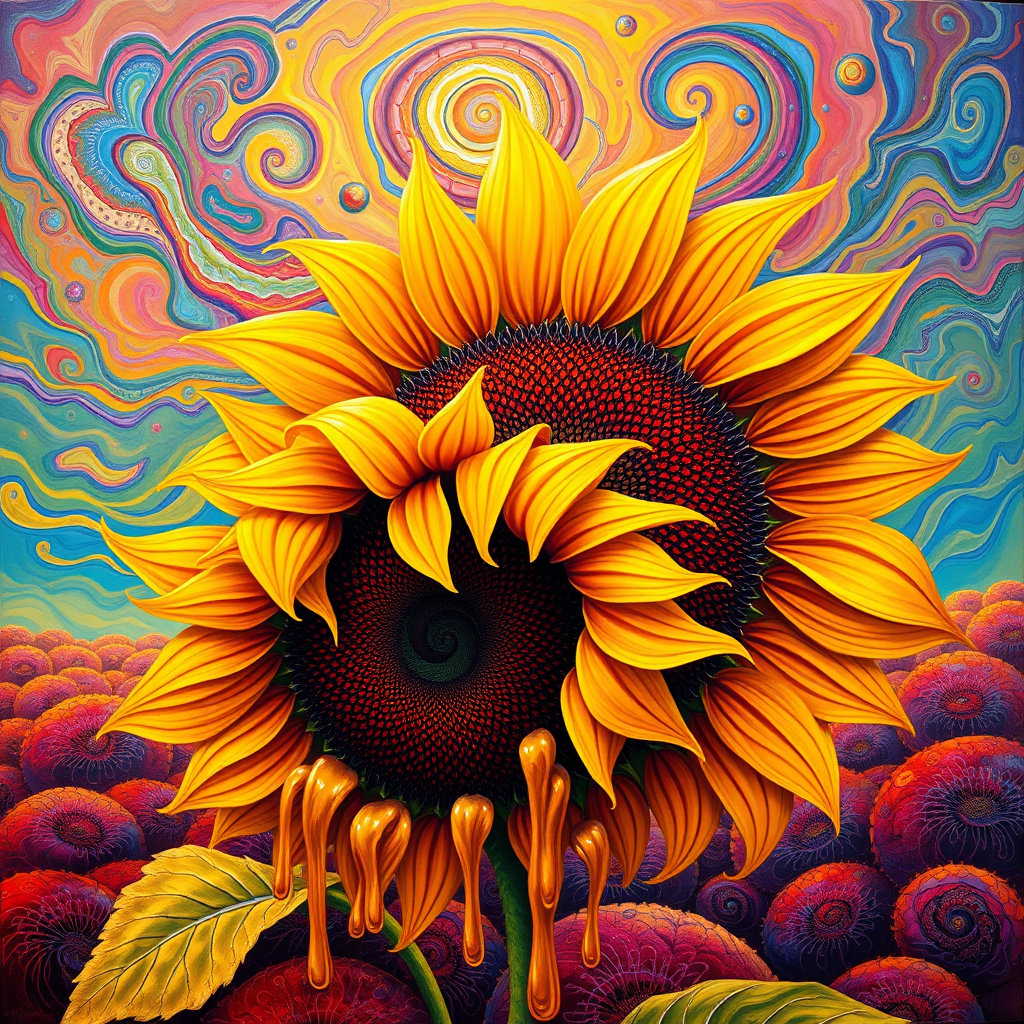 A vivid and dreamlike painting of a sunflower with swirling petals and elongated forms, its essence melting and dripping like wax. The sunflower bends and contorts in a surreal landscape reminiscent of Salvador Dali's fluid distortions, with echoes of Pablo Picasso's fragmented cubism. The scene is awash in bold colors and intricate textures, capturing a sense of movement and transformation, as if the flower is in a constant state of becoming. The sky above is a swirl of vibrant hues, adding to the overall sense of a psychedelic, otherworldly atmosphere.