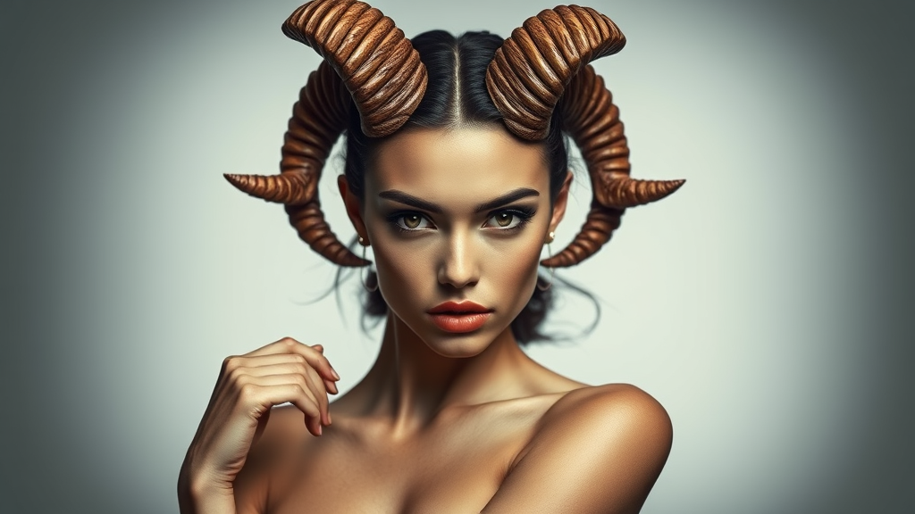 A vivid and dynamic portrait of a woman posing confidently, with intricate, sculptural horns adorning her head. The artwork reflects the creative essence of Brian Jungen's innovative transformations and the sophisticated, high-fashion touch of Steven Meisel. The image's aspect ratio is tall and elegant, 89:128, capturing the full grace of the pose. The background is minimalistic, focusing attention on the subject's expressive eyes and the elaborate design of the horns. The style is raw, with bold textures and a slightly intensified color palette, adding depth and intensity. Subtle creative elements, such as a hint of surrealism in the horns and a touch of ethereal light around her, enhance the visual story without straying from the core concept.