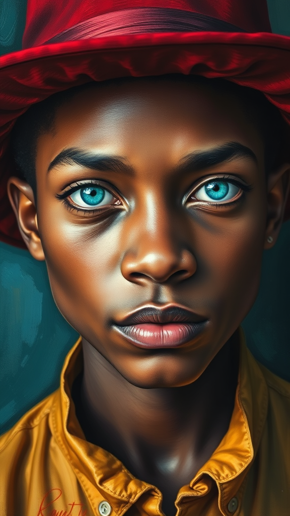 A vivid and dynamic portrait showcasing a person with striking turquoise eyes, adorned with a deep crimson hat and a golden shirt. The painting explores bold contrasts and a rich palette, with an emphasis on the interplay of colors to evoke emotion and intensity, capturing the essence of individuality and expression.