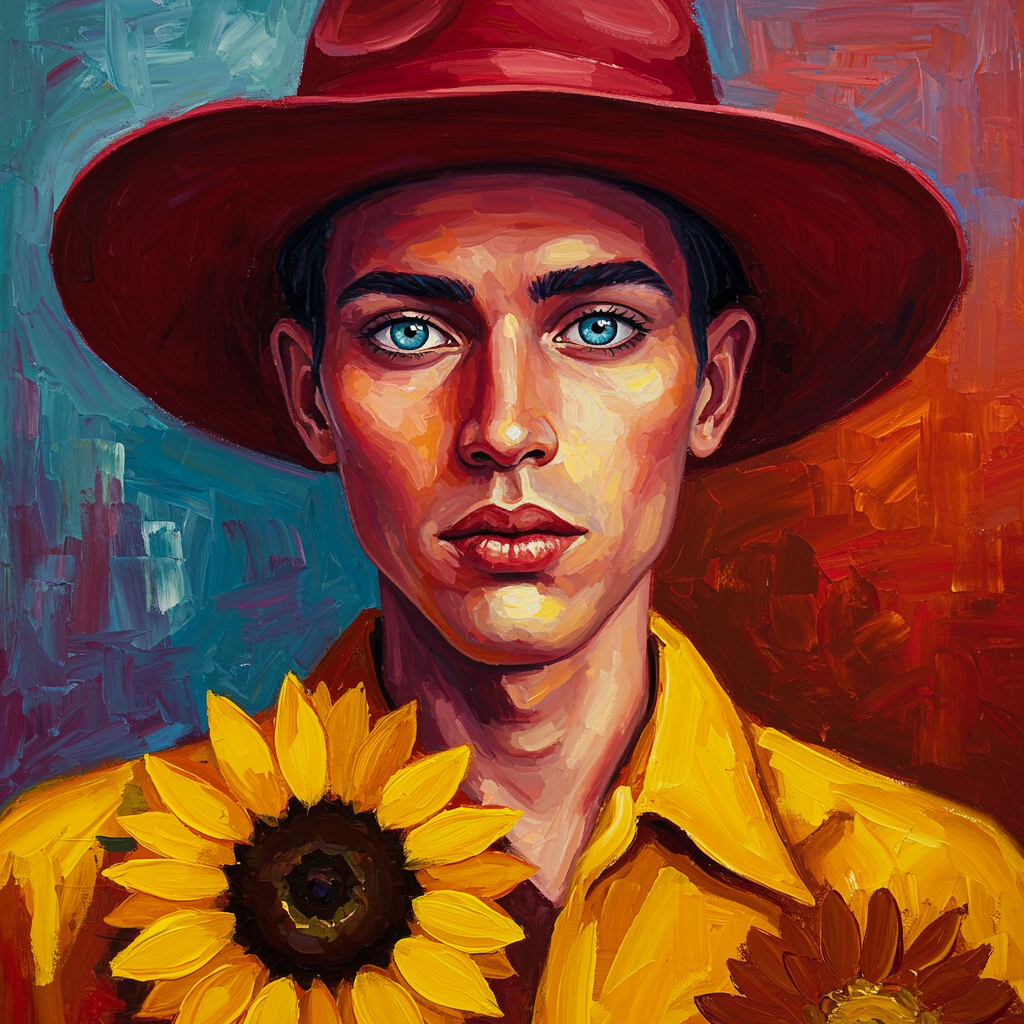 A vivid and emotive portrait capturing a person with striking azure eyes, donned in a crimson hat and a sunflower-yellow shirt, the painting employing a bold and dramatic color palette to enhance their enigmatic expression against a vibrant, multi-hued background.