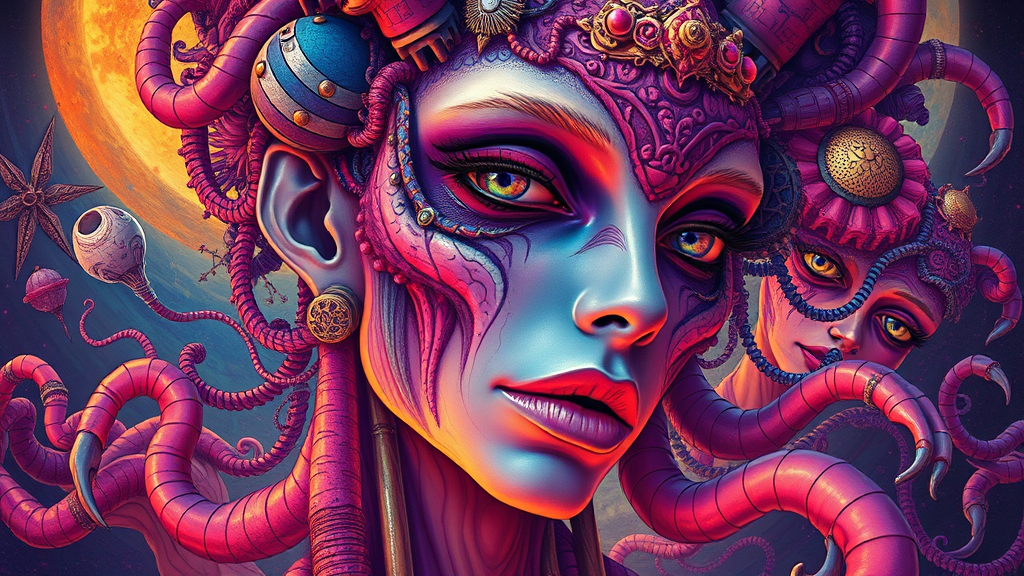 A vivid and intricate psychedelic portrait with a romanticism-inspired vibrant color scheme, blending elements of cinematic and artstation styles with a touch of Moebius and Greg Rutkowski. The image is characterized by abstract forms and surreal anatomy, featuring distorted proportions, unusual limbs, and unique facial elements. It presents an exploration of the bizarre and the fantastical, with dreamlike qualities that push the boundaries of conventional beauty, embracing a chaotic yet captivating aesthetic with an essence of otherworldly creativity.