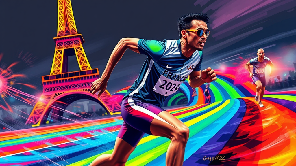 A vivid and intricately airbrushed painting of an Olympic athlete sprinting with dynamic energy, reminiscent of Greg Rutkowski's style. The runner is clad in eye-catching, multicolored gear, radiating vibrant hues against the iconic backdrop of the Eiffel Tower. Captured in the thrill of mid-race, he speeds along a track composed of swirling rainbow patterns. Sporting sleek sunglasses and official France Olympic attire, the athlete embodies the spirit of the upcoming Paris games, with "Paris - 2024" prominently displayed on his arm. Subtle shifts in light and shadow emphasize the energy of the moment, lending depth and motion to the scene.
