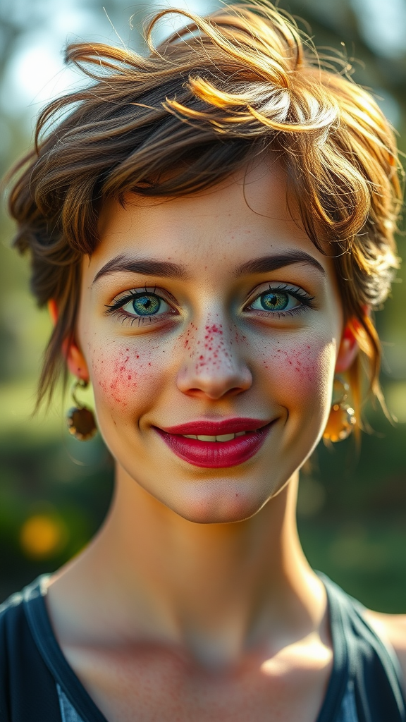 A vivid and realistic portrait of a 20-year-old woman with freckles, large expressive eyes, and tousled short hair captured in an outdoor setting. Her face is symmetrical and her skin glistens with natural beauty under soft, diffused sunlight. The scene is rich with vibrant colors, utilizing volumetric lighting that enhances her features. This photorealistic composition, akin to magical photography, is shot with an 85mm lens, ensuring ultra-detail in the imagery. Her bright smile adds life to the portrait, embodying youthful energy and authenticity in a serene environment.