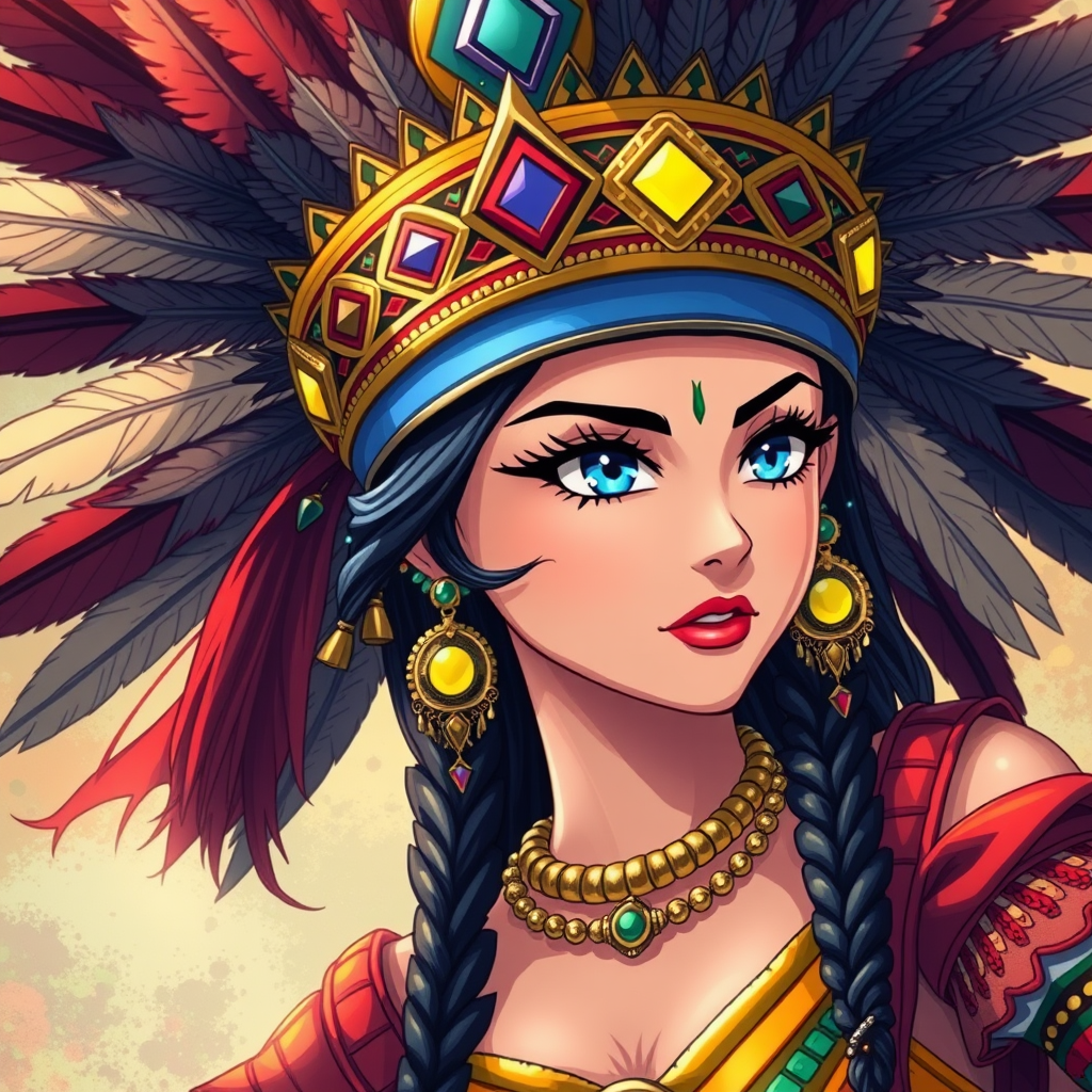 A vivid anime-inspired illustration of an Aztec princess wearing a Moctezuma-style headdress, featuring intricate details and an aura of inner light. The artwork captures the essence of a Ghibli Studio masterpiece with vibrant colors and the dynamic energy reminiscent of JoJo's Bizarre Adventure. The portrait is in an action-filled pose, showcasing her regal presence and adorned in traditional Aztec attire, with small artistic liberties that enhance the mystique and grandeur of her character.
